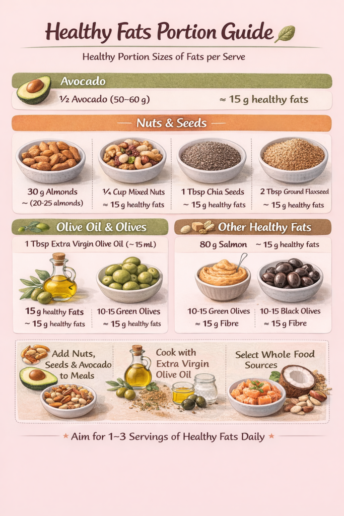 A healthy fat intake is 20% to 35% of total daily calories. Focus on omega-3 fatty acids (fatty fish, flaxseed, walnuts) to reduce symptoms and prioritise extra virgin olive oil, nuts, and avocados while limiting saturated fats found in animal meats to less than 10% of daily calories.