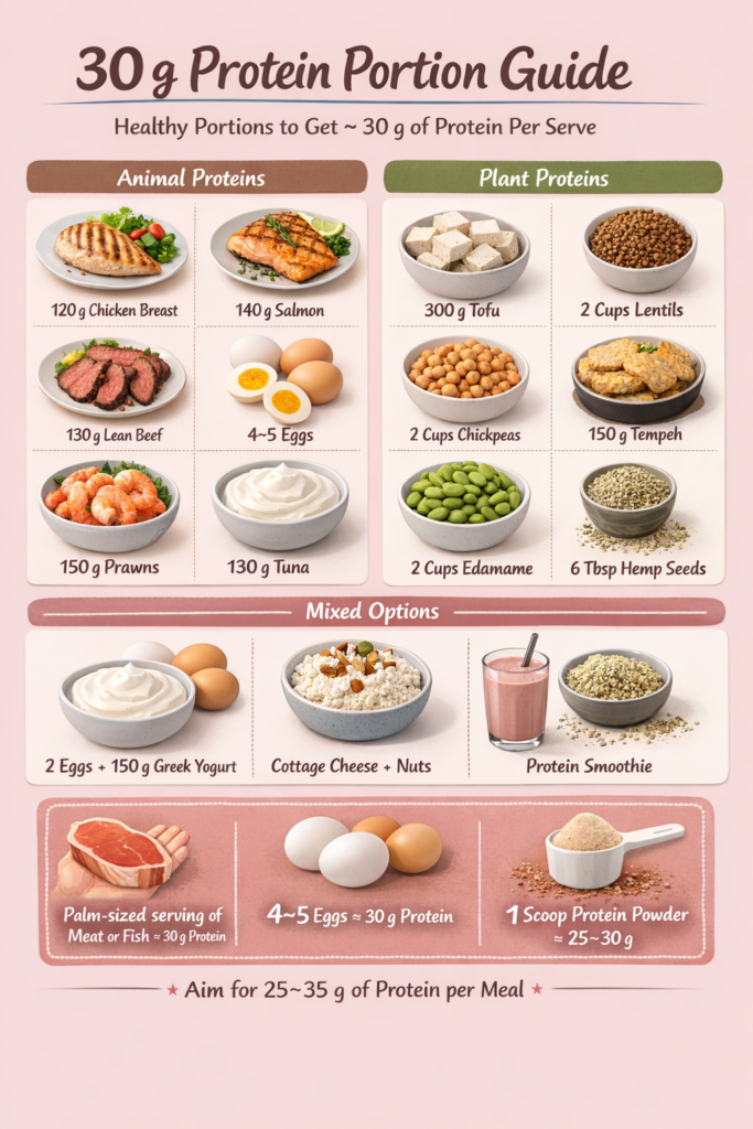 Depending on your current weight – aim for 1.2 to 1.6 grams per kilogram of body weight daily. Eg: I’m 80kg so I eat approximately between 96 to 128 grams over the day. I tend to eat more protein when I am doing strength training to support muscle mass improvement.